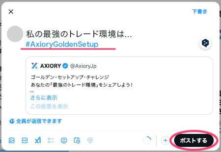 引用ポストには、上記質問への答えと併せて、ハッシュタグ「#AxioryGoldenSetup」を必ず記載してください。投稿ボタンを押して完了です!