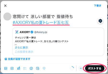 引用ポストには、上記質問への答えと併せて、ハッシュタグ「#AXIORY私の夏トレード五七五」を必ず記載してください。投稿ボタンを押して完了です!