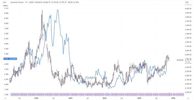 一方、アルミニウムCFDを取引するトレーダーにとってより重要なのは、天然ガスとの相関関係です。ヨーロッパの製錬所は天然ガスに大きく依存しています。この関係が顕著に表れたのが2022年のことで、ヨーロッパのエネルギー価格が急騰した際に、アルミニウム価格はわずか4ヶ月で55%上昇しました。天然ガス価格はアルミニウム価格の先行指標になり得ますが、常に明確な関係が続くとは限らない点には注意が必要です。