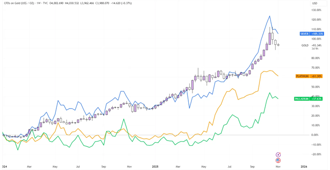 図:2024年1月~2025年11月における、4銘柄の収益率(%)の推移 - ゴールド: ローソク足、シルバー: 青線、プラチナ: オレンジ線、パラジウム: 緑線