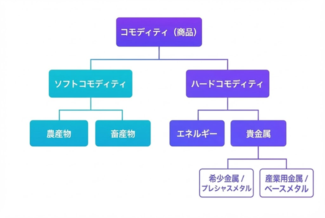 貴金属は、広大なコモディティ(商品)市場というアセットクラスにおける中核的な構成要素です。しかし、「コモディティ」と一口に言ってもその範囲は非常に広いため、貴金属がその中で具体的にどのような位置づけにあるのかを整理しておくことが重要です。この市場には多くの細分化された分類(サブカテゴリー)が存在し、使われる専門用語も多岐にわたるため、トレーダーが混乱しやすいポイントでもあります。