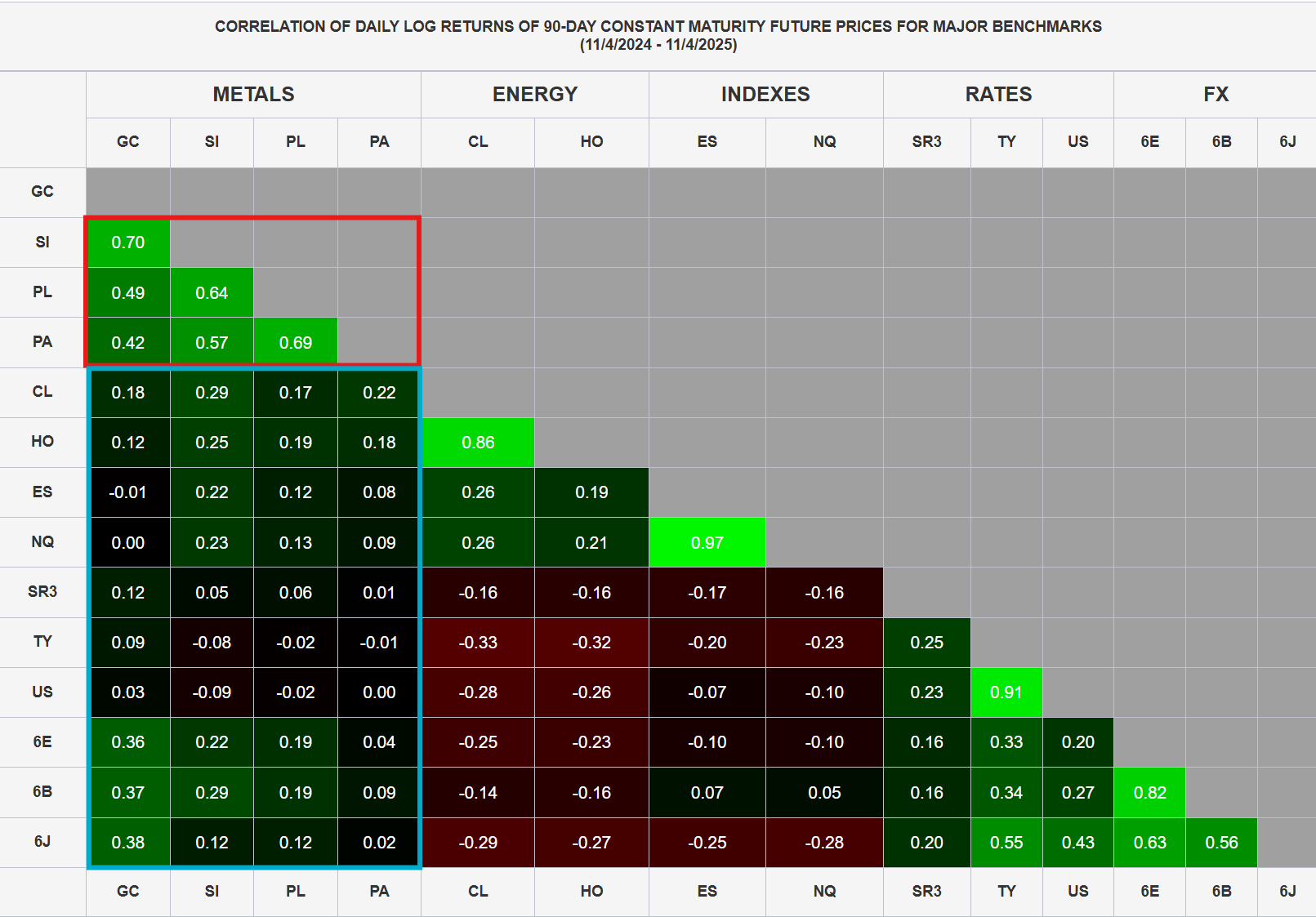 図:貴金属(Metals)と、その他の主要アセットクラスであるエネルギー(Energy)、株価指数(Indexes)、金利・債券(Rates)、外国為替(FX)との相関関係を示すマトリックス表(2024年11月~2025年11月)