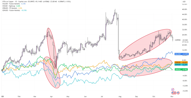 チャートを見ると、個別のボラティリティに違いはあるものの、これら5つの銘柄は概ね同じ方向に動いていることが分かります。特筆すべき動きとして、トランプ大統領が銅に対して50%の関税を課すよう命じた際、銅価格が1日で18%も急落した場面がありました。しかし、全体として見れば、その他の動きは大部分で一致しています。