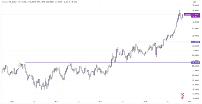 そのため、この供給ダイナミクスは価格の「放物線を描くような急騰(パラボリックな動き)」を許容する土壌となります。つまり、シルバーには価格上昇が止まりにくく、さらに上値を追う余地が生まれやすいのです。