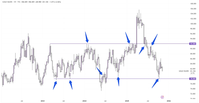週足チャートにおける金銀比価(GOLD/SILVER)