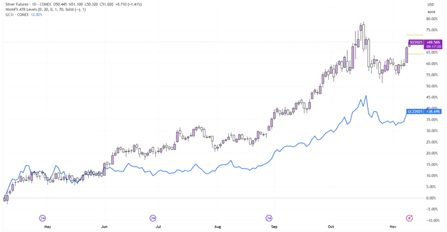 2025年4月~11月におけるシルバー価格とゴールド価格の比較
