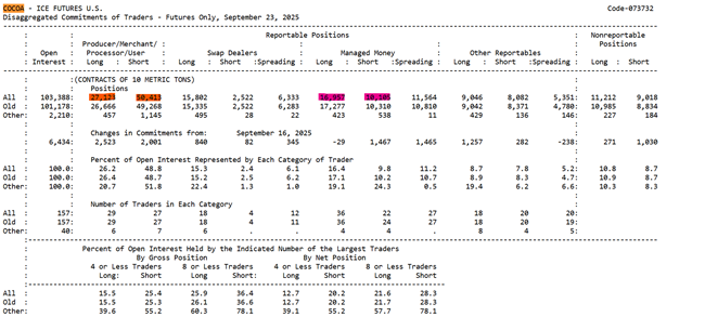 以下は、ココアに関する最新のCOTレポートのスクリーンショットです。