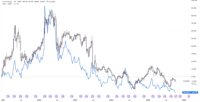 🟣 小麦はコーンよりも高価ですが、家畜飼料として実用的な代替品となります。両者は強い相関関係にありますが、小麦は人間の食用として広く利用され、栄養価も高いため、通常はプレミアム(上乗せ)価格で取引されます。