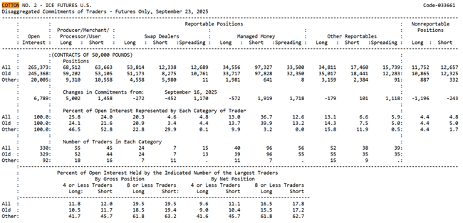 実需筋のポジションは、将来の価格動向について彼らがどのように見ているかを読み解く手がかりになります。建玉明細(COTレポート)で実需筋のネットショート(買い待ち)が極端に大きくなっている場合、彼らは現在のコットン価格を高値圏と捉えていて、保有在庫を高値で売却するための調整を行う可能性があります。