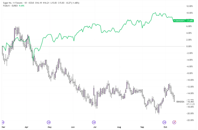 すなわち、サトウキビ生産の約39%を占めるブラジルの製糖工場がエタノール生産へ切り替えると、砂糖の供給が減少し、価格の下支え要因となります。こうしたパリティ(均衡関係)が、世界の砂糖価格に事実上の下限価格を設定された状態を生み出します。