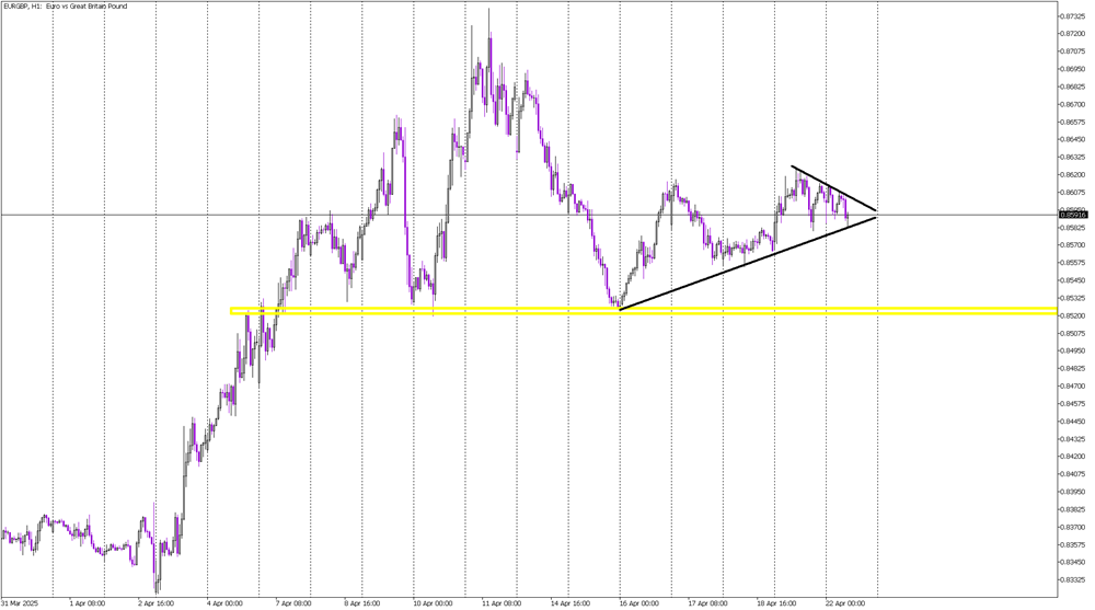 In today’s technical section, let’s examine the Euro to British Pound, which is currently trading within a narrowing range — a classic pennant formation. This pattern is marked by two converging black trendlines, reflecting market indecision and reduced volatility, often a precursor to a sharp breakout.