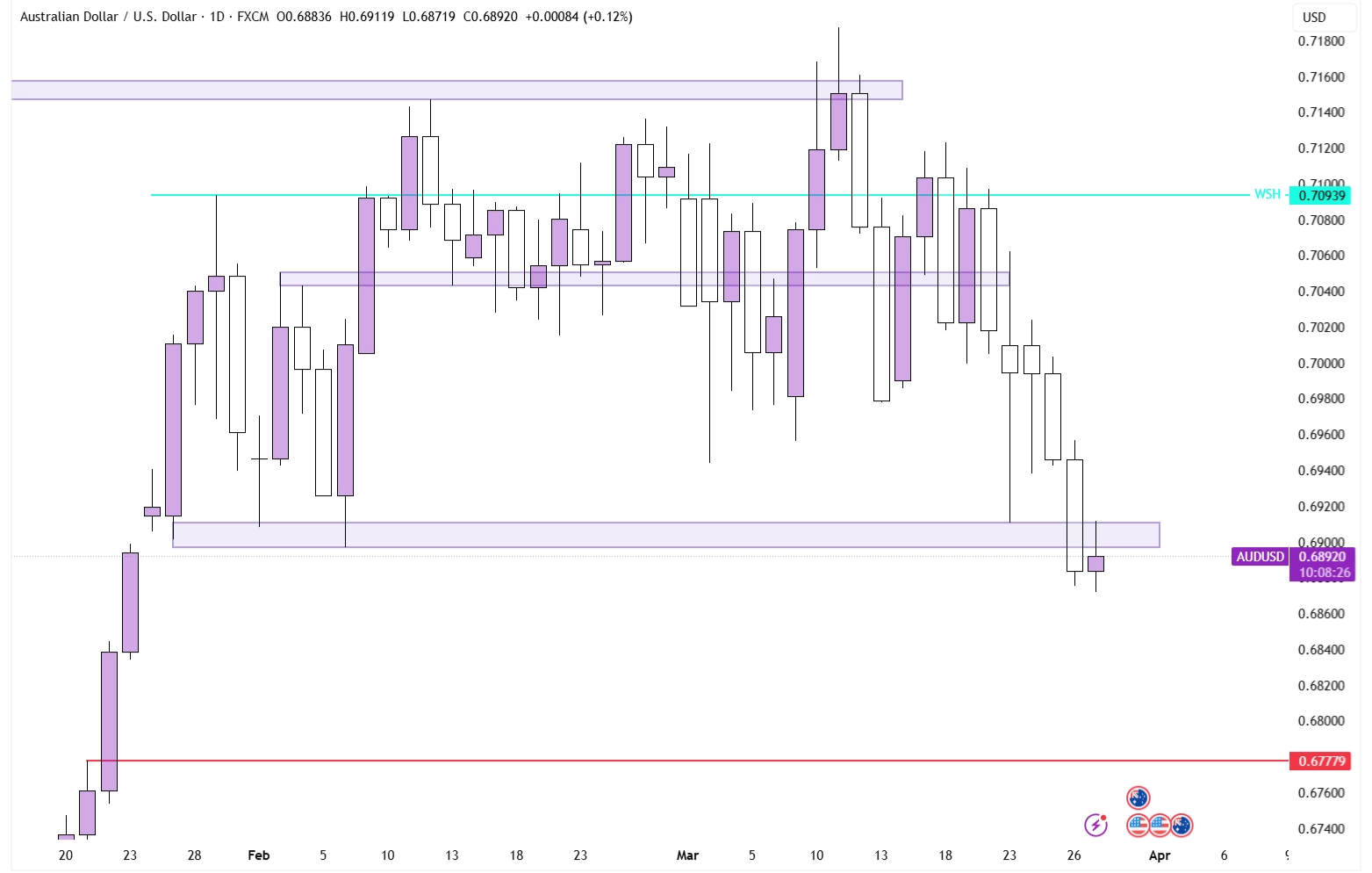 On Thursday, price lost the lower bound of this multi-month range, with price now retesting the underside of it, which has effectively turned into resistance. If price manages to close below the upper end of this now resistance zone, it will shift the technical picture bearish here. From that point on, the next logical downside target sits at 0.67779, consisting of two old highs.