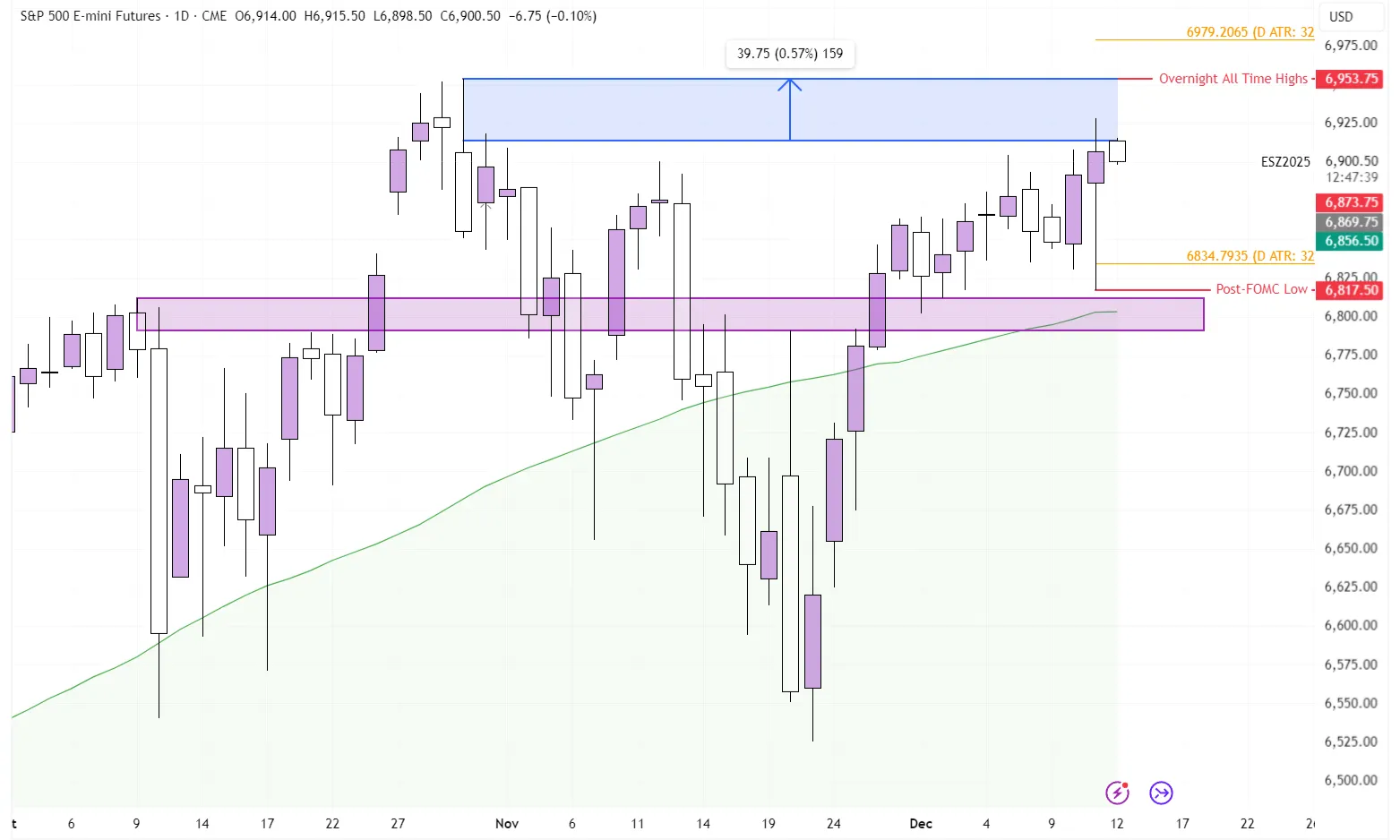 The S&P 500 saw a slightly stronger week compared to the Nasdaq, with the ES now just 40 points of its previous All-Time-High. Since these ATHs were created with "poor highs" (highs that were not aggressively rejected), market theory often suggests these levels may get retested in the near future. Now that markets have cleared potential interest rate scares, it seems likely that prices attempt a Christmas rally.
