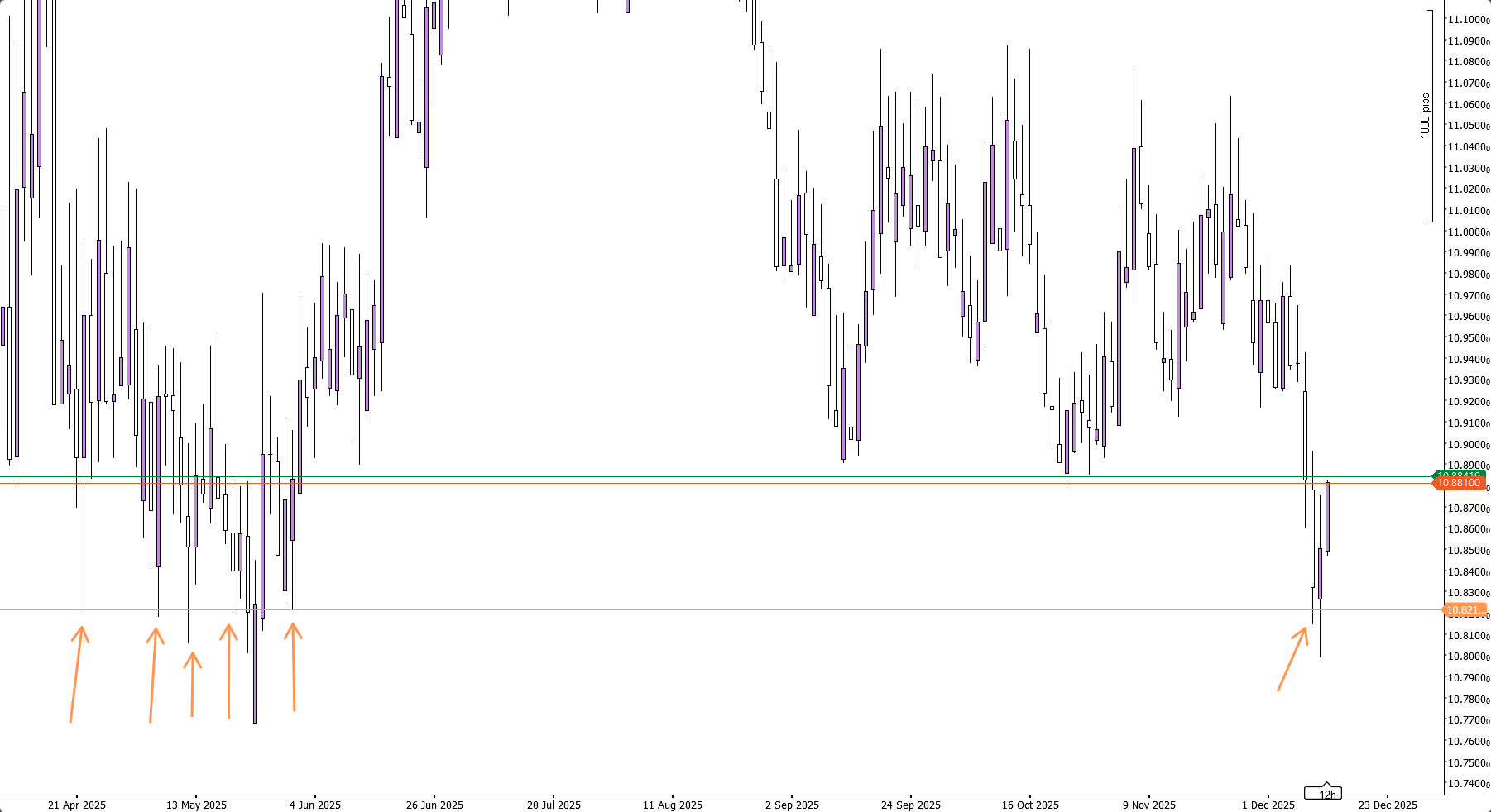 Secondly, Friday's price action is now continuing the momentum of Thursday’s SFP. This is a crucial piece of context to determine whether Daily candles provide a Higher-Timeframe bias going forward. Should price manage to close above Thursday’s high at 10.874, traders may view this as a solid bullish bias heading into next week. Especially the 10.874 level becomes key, as prices often retest the high of a bullish bias candle like this one.