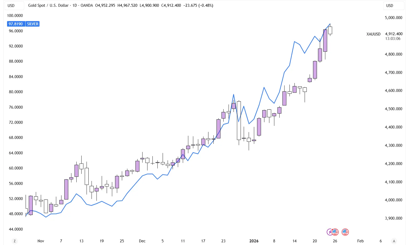 Gold is sitting right below the $5,000 mark, while Silver is just inches away from reaching $100/ounce. Both levels carry extremely high amounts of psychological importance and should be tested relatively soon.