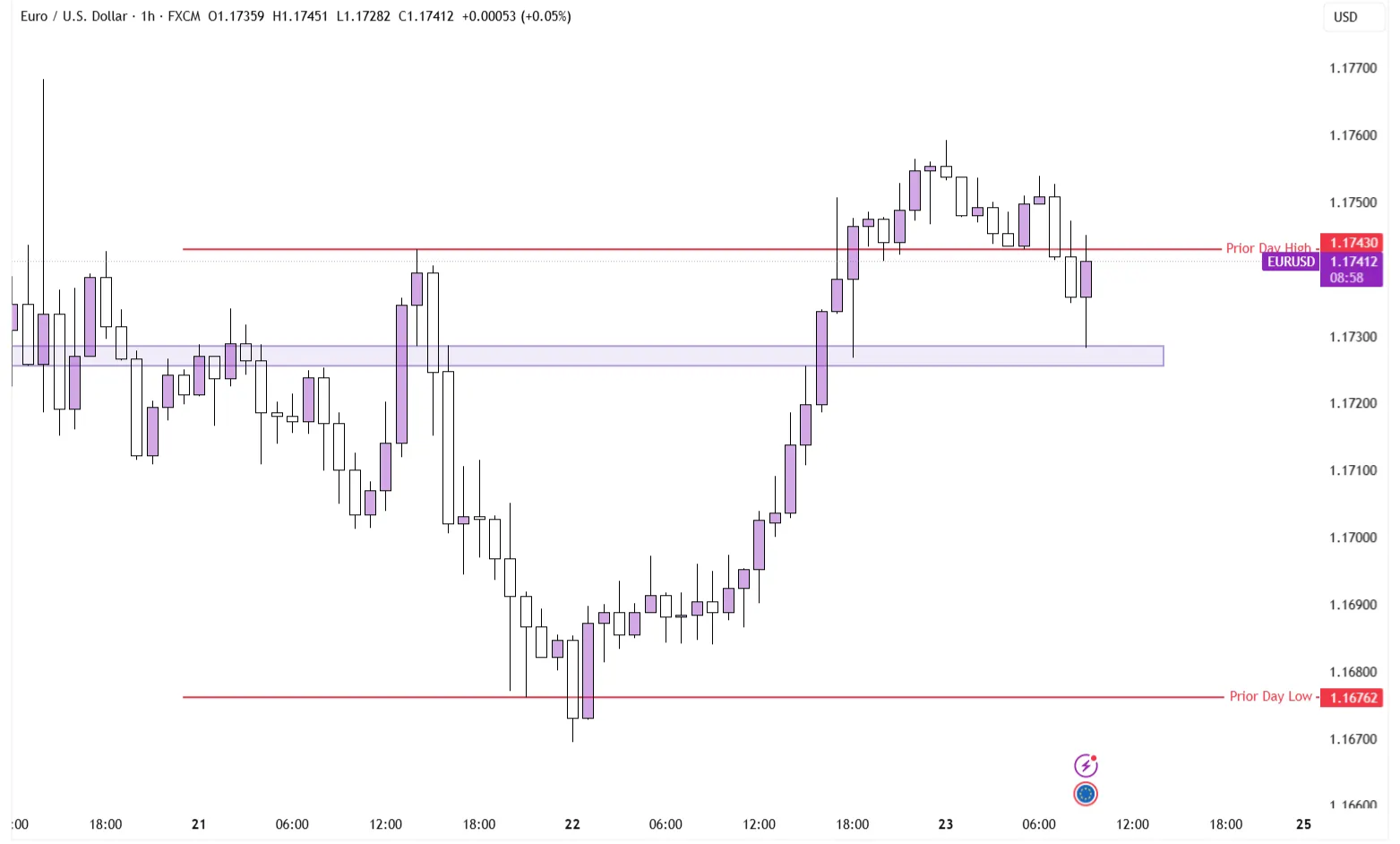 The key level seems to sit at 1.1725-1.1729. This level is especially crucial as it’s a level that’s right underneath the Prior Day High and has gotten plenty of touches from both sides. From this level, we might then target new highs, which is in this case either the high of the day of the engulfing at 1.1759 or the current weekly high at 1.1768.