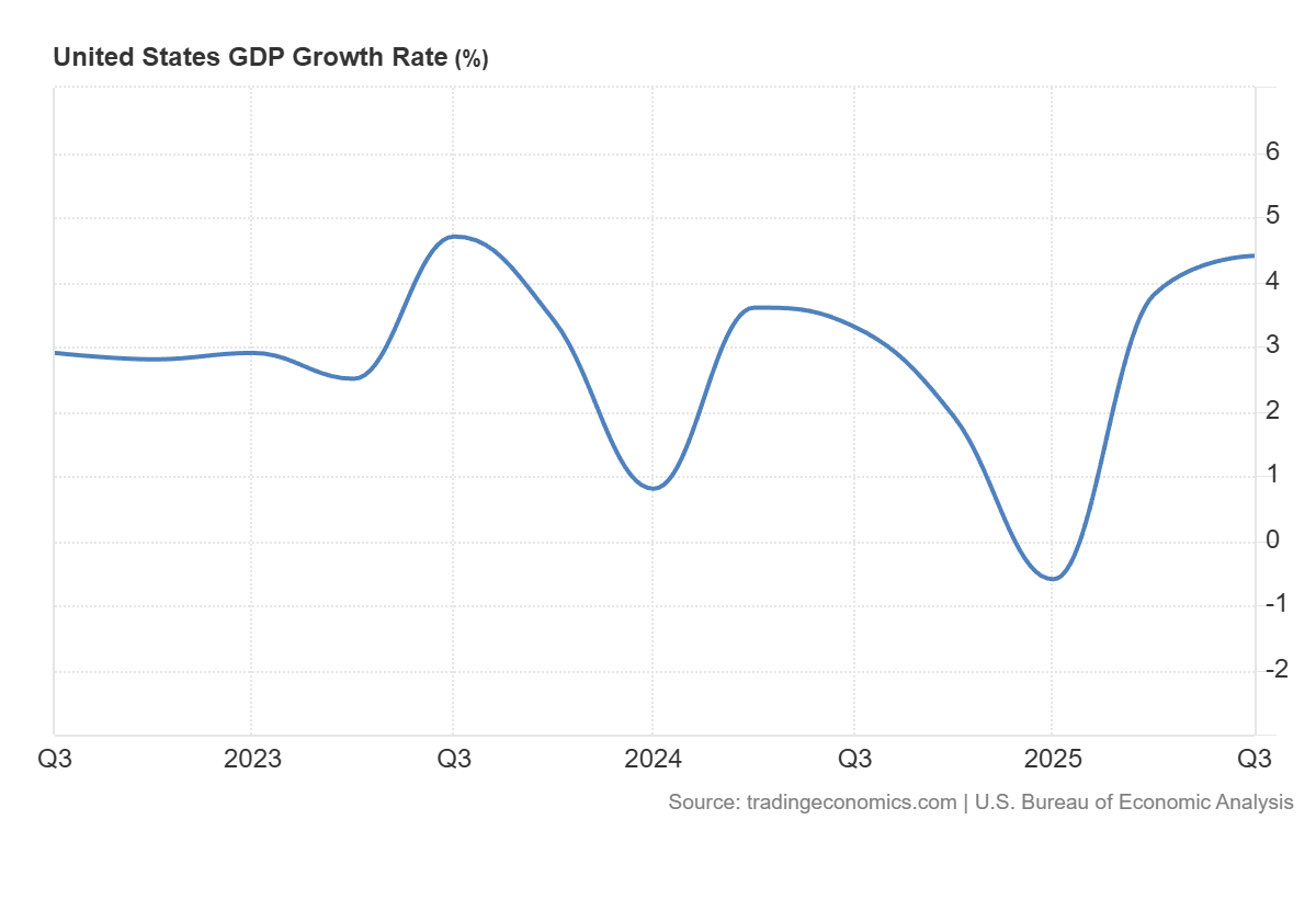 Despite rocky politics, U.S. economic exceptionalism continues. Year-over-Year GDP growth came in at 4.4% for the third quarter of 2025, beating the expectations at 4.3%.