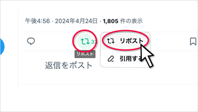 SNSチャレンジ投稿のリポストボタンを押し、「リポスト」オプションを選択してください。