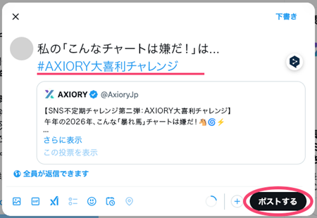 (3)ハッシュタグ #AXIORYトレード抱負 を追記し投稿 |