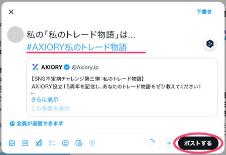 3 . あなたの「トレード物語」+ハッシュタグ「#AXIORY私のトレード物語」をつけて投稿