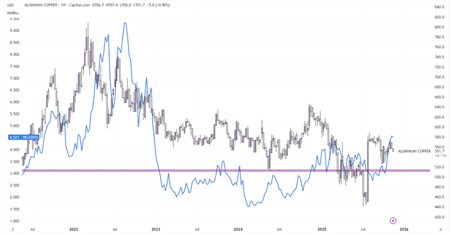 さらに、エネルギー価格とアルミニウム価格の動的な関係は、アルミニウムと銅の価格比率(Al/Cuレシオ)を見ることで、より明確になります。アルミニウムは銅に比べて生産にはるかに多くのエネルギーを要するため、両者の関係は天然ガス価格の変動と非常に強い相関を示す傾向があります。