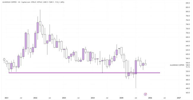 アルミニウムと銅の価格関係を把握するには、アルミニウム価格を銅価格で割った比率をモニタリングする方法が有効です。ロンドン金属取引所(LME)のアルミニウム契約とニューヨーク商品取引所(COMEX)の銅契約を比較した以下のチャートを見ると、500という水準が明確なサポートラインとして機能していることが分かります。