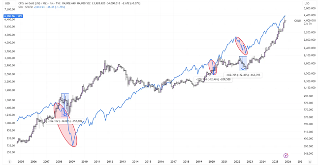 さて、ゴールドにはもう一つ忘れてはならない通説、「安全資産」としての役割があります。つまり、「株価が下落したとしても、ゴールド価格は安定しているか、あるいは逆に上昇するはずだ」という考え方です。