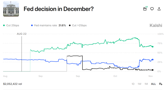 この特定の例では、市場のコンセンサス(合意)が完全に形成されていません。「0.25%(25bps)の利下げ」の確率が66~67%、「金利据え置き」の確率が32%となっており、意見が割れている状態です。