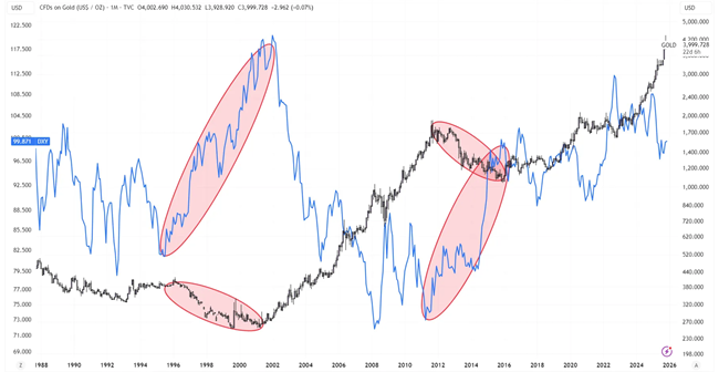 長期の月足で見ると、両者の連動性はより強まっているように見えます。しかし、ここで注目すべき点は、ゴールド価格が長期的な下降トレンドを形成するためには、米ドル指数(DXY)が持続的かつ急激な上昇(ラリー)を続ける必要がある、という事実です。