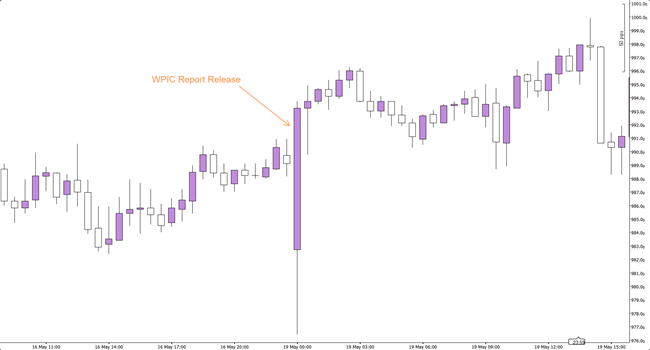 上記のチャートは、WPICレポートが市場に与えた影響を明確に示しており、予想を上回る将来の供給不均衡を示す強気のレポート内容を受けて、価格が急激に上昇しました。